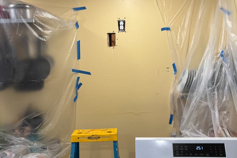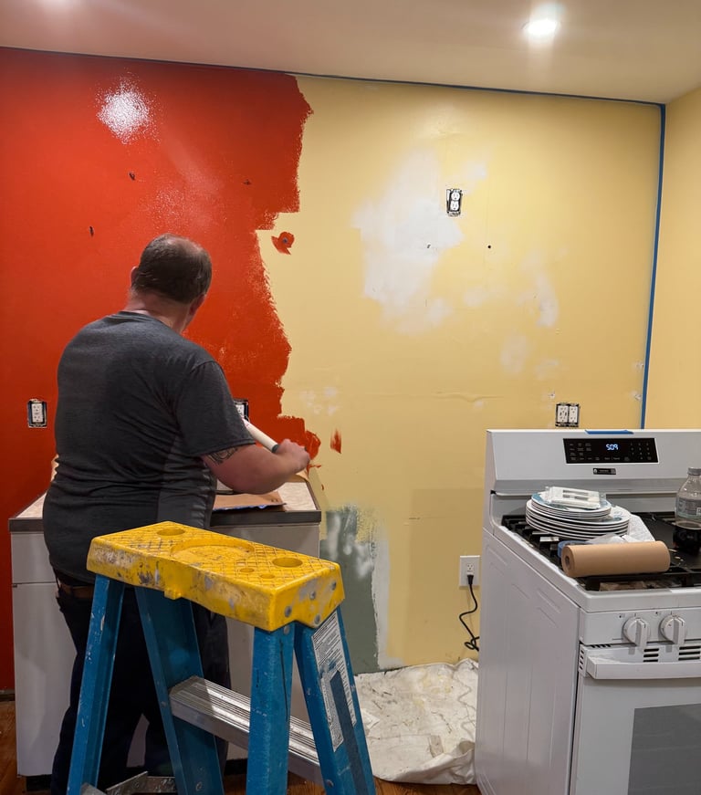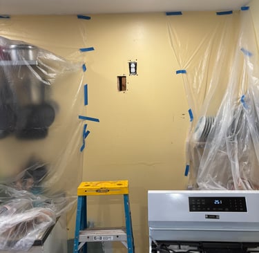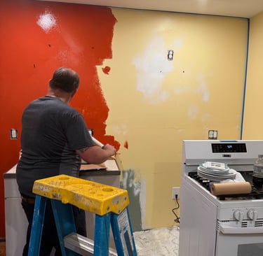 The customer decided to make a small change and instead of having me paint the patch the buttercream yellow that was already there, decided to go with an orange accent wall to bring some flair into her kitchen. I tape off everything as well as use drop cloths to make sure her kitchen floor doesn't change colors to match her wall!
