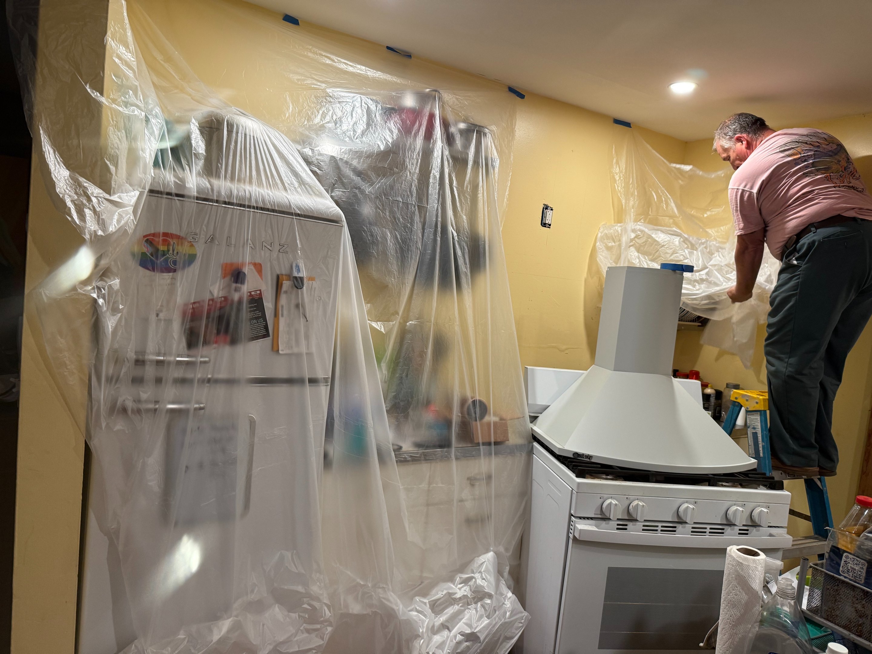 This is as close as we have for a before picture, but you can see me taping the kitchen off to prevent drywall dust from getting everywhere.