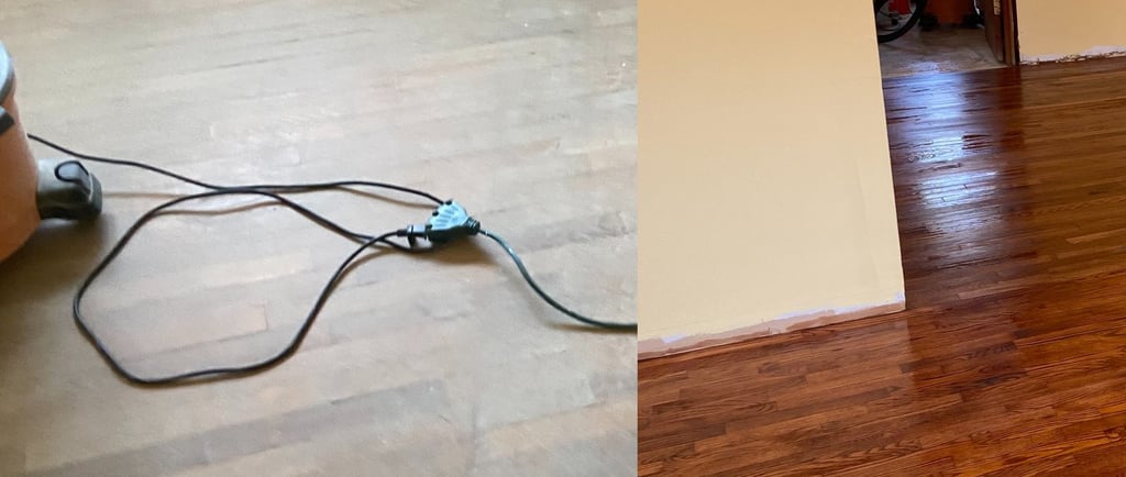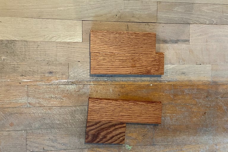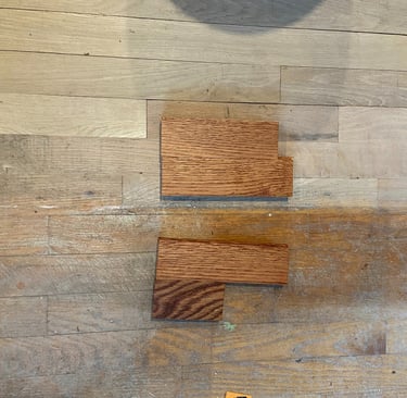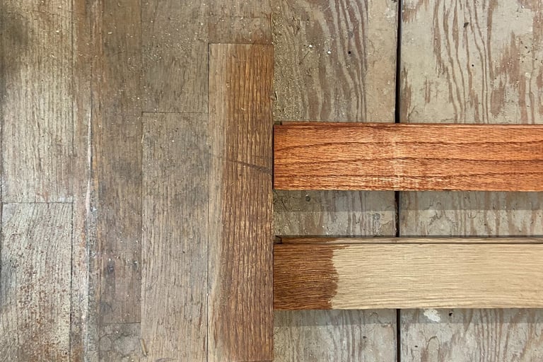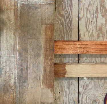 Here I am laying the new floor and tieing it into the existing floor. Next we needed to take some samples and see what would be the best stain combo to tie rooms together.